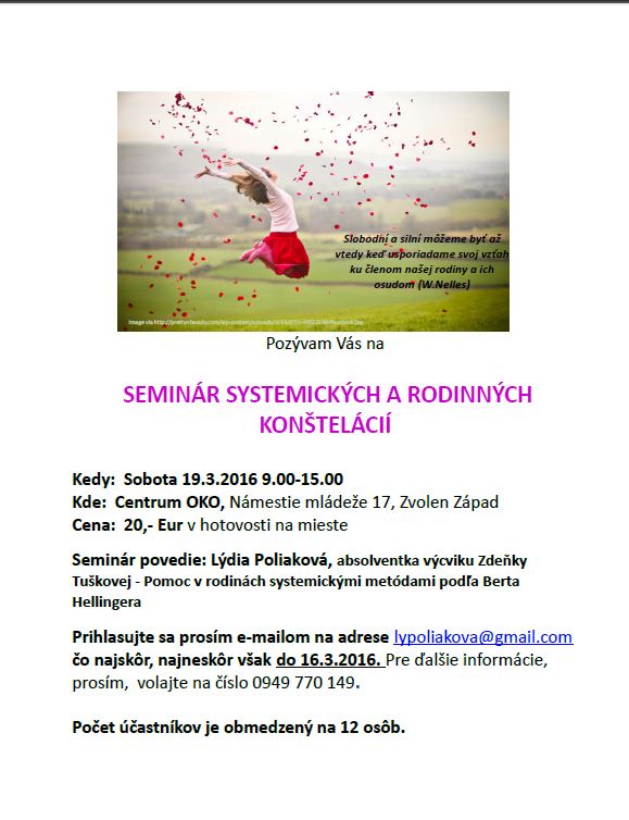 Najbližší seminár rodinných a systemických konštelácií sa bude konať 17.10.2015 od 9:00 do 16.00 v centre OKO, 9. ZŠ Námestie mládeže, sídlisko Zvolen Západ. Rada uvítam tých, ktorí sa už s konšteláciami niekedy stretli ale aj tých, ktorí majú chuť sa s touto metódou zoznámiť. Bližšie informácie nájdete v priloženej pozvánke.