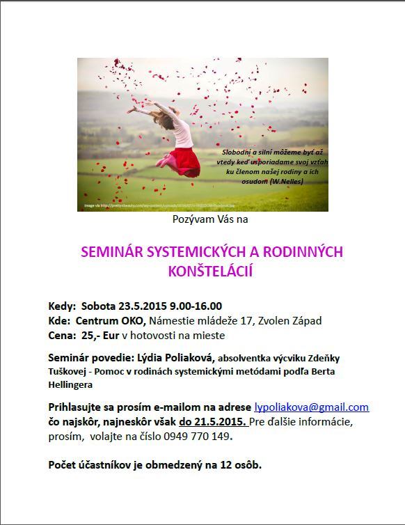 Najbližší seminár rodinných a systemických konštelácií sa bude konať 23.5.2015 od 9:00 do 16.00 v centre OKO, 9. ZŠ Námestie mládeže, sídlisko Zvolen Západ. Rada uvítam tých, ktorí sa už s konšteláciami niekedy stretli ale aj tých, ktorí majú chuť sa s touto metódou zoznámiť. Bližšie informácie nájdete v priloženej pozvánke.prva.JPG (74,2 kB)